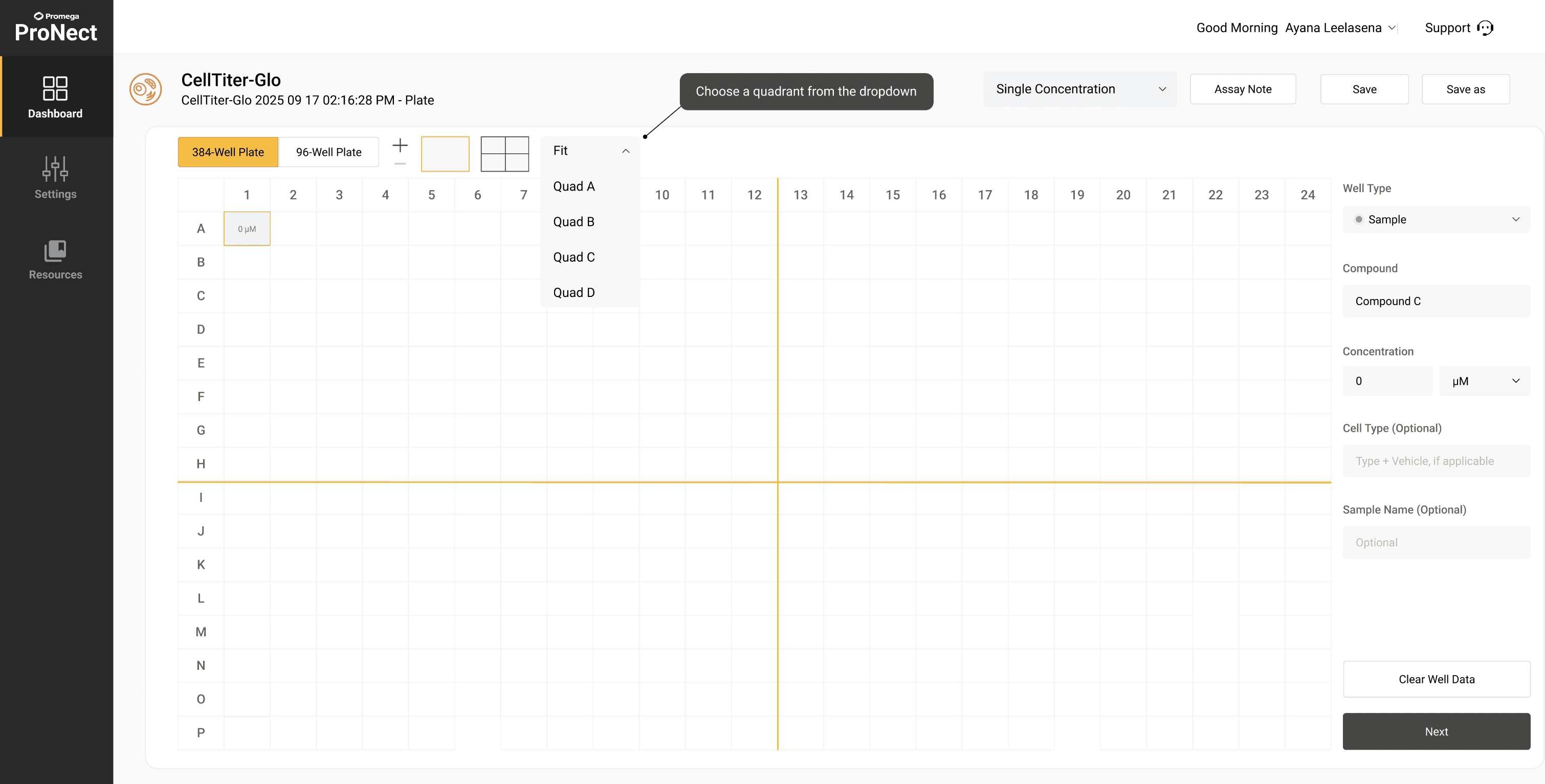 Added flexible zoom levels to better support different user workflows. In addition to the full plate and single-quadrant views, users could now: Zoom into two quadrants at once (A+B or C+D) for improved context when reviewing or editing adjacent regions. Zoom further into a single quadrant, displaying only six columns at a time, to support high-precision input where detail and accuracy are critical, such as dose-response curves or replicates.