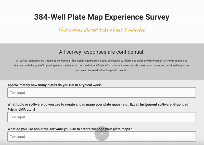Pain points: Excel setup is extremely manual, especially for 384-well formats. Users must build 16x24 grids and label wells by hand. Engagement: Both respondents expressed interest in participating in future research.