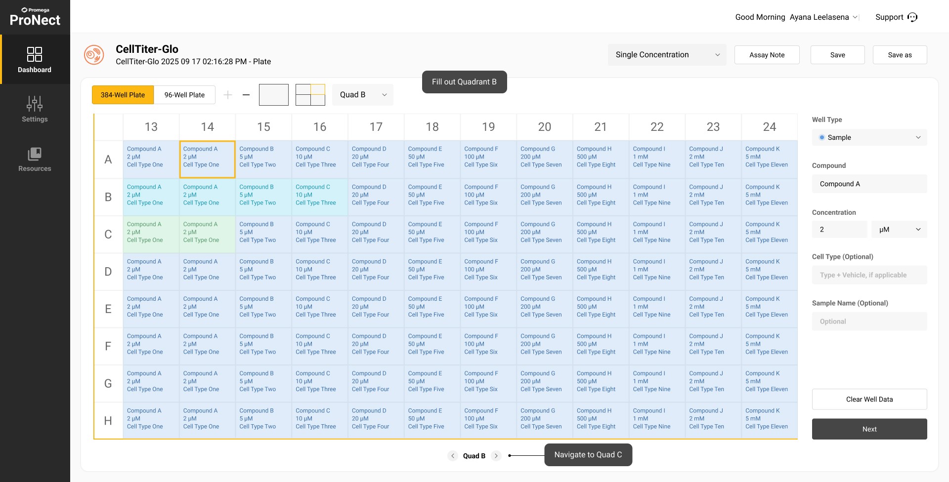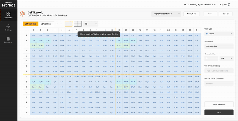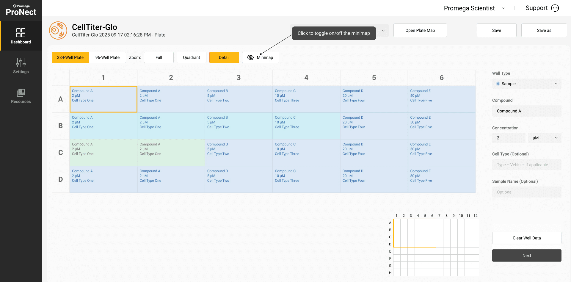 Optimizing Cell Assay Workflows from expanding 96-Well Plate Map Setup design to 384-Well Plate Map design on the Promega ProNect™ Data Platform.